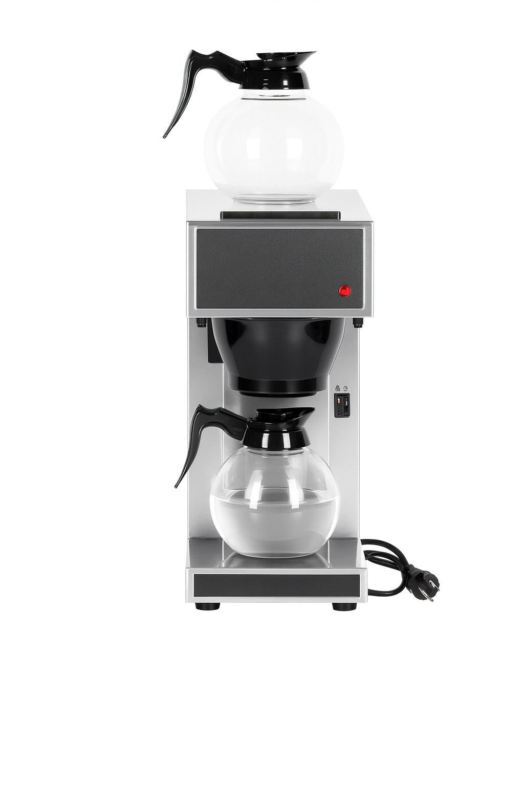 Stainless steel drip coffee maker with dual glass carafes and warming plates. Designed for continuous brewing and serving in cafés, restaurants, and offices.