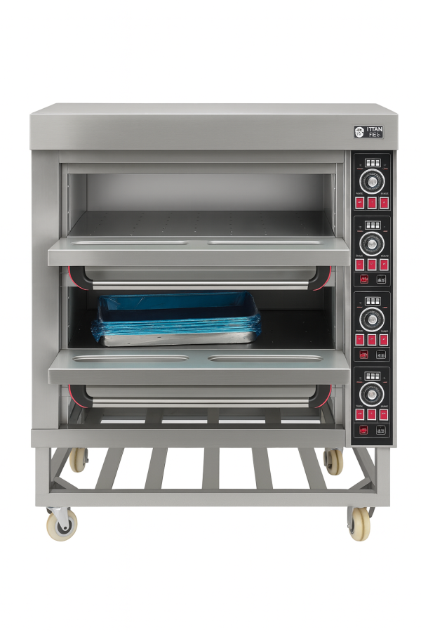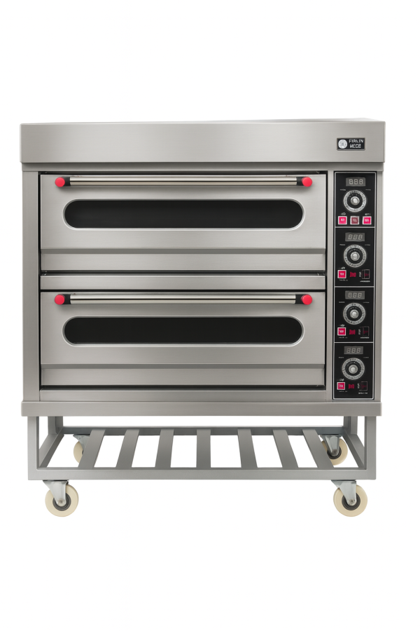 The Firalin MECEB Double Deck Electric Pizza Oven is designed for heavy-duty commercial use, making it ideal for pizzerias, bakeries, and restaurants. With two independent baking chambers, it offers high capacity and flexibility for preparing multiple pizzas or baked goods simultaneously. Each deck features digital temperature controls, durable heating elements for even heat distribution, and insulated stainless-steel construction to maximize efficiency