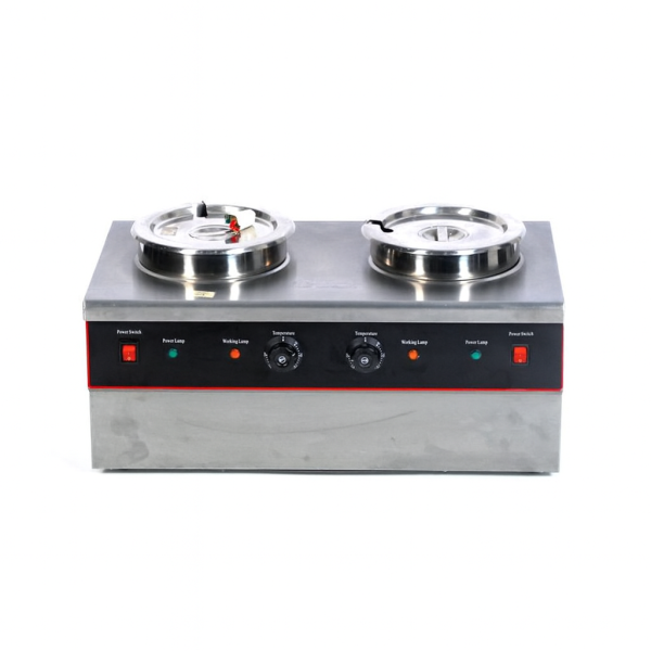 Stainless steel countertop soup warmer with two round kettles and fitted lids. Each kettle has individual temperature control knobs for precise heat adjustment. Equipped with power switches, indicator lights, and working lamps for safe operation.
