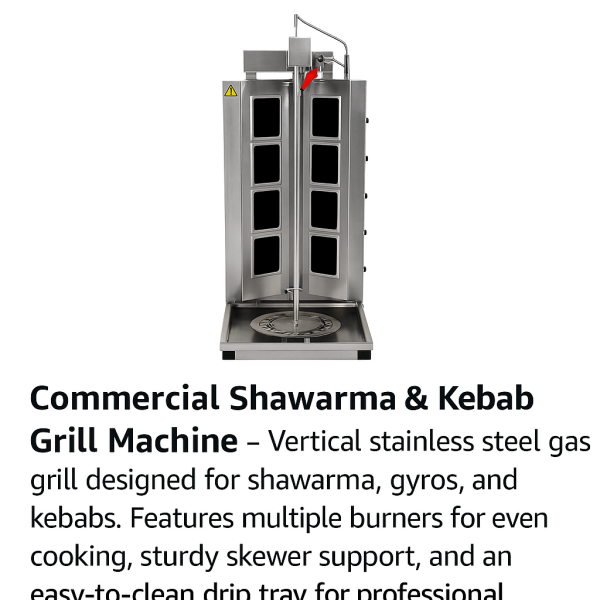 A stainless steel commercial vertical broiler designed for cooking shawarma, gyros, and doner kebabs. It uses multiple heating elements along the vertical frame to evenly roast stacked meat, which rotates on the central spit for consistent cooking. Commonly used in restaurants, fast food outlets, and kebab shops