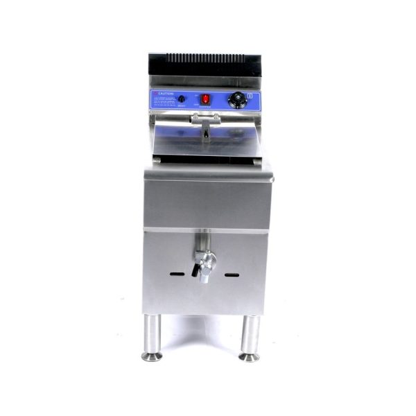 Stainless steel deep fryer with temperature control and front drain valve for easy oil disposal. Built for heavy-duty use in restaurants, fast food outlets, and catering kitchens.