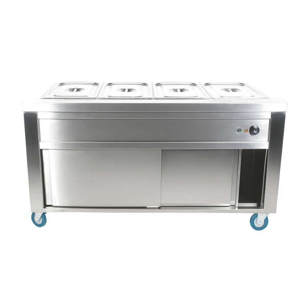 stainless steel mobile unit with multiple Gastronorm pans and lids for keeping food warm.