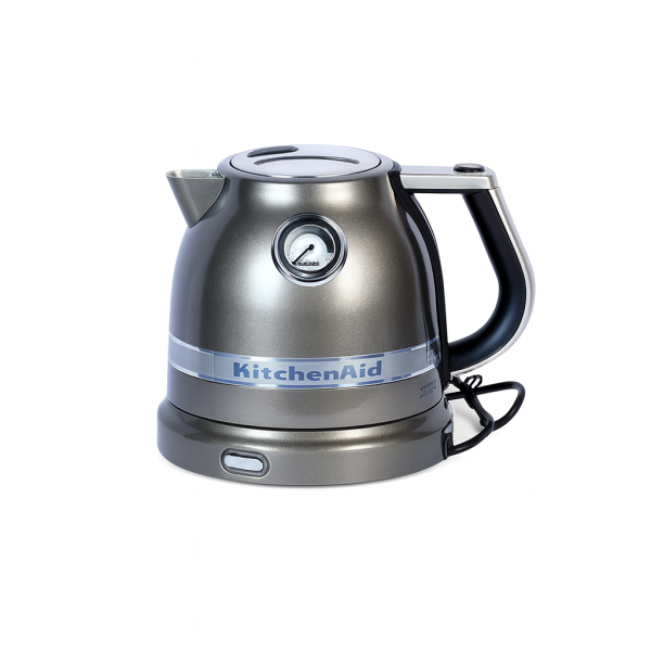 Stylish stainless steel electric kettle with built-in temperature gauge. Features a comfortable handle and 360° swivel base, perfect for fast and precise water heating in kitchens, cafés, and tea service areas.