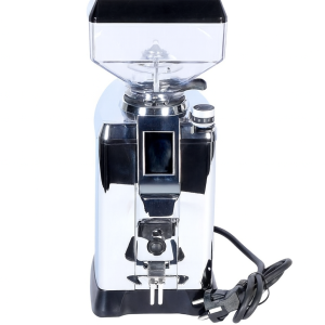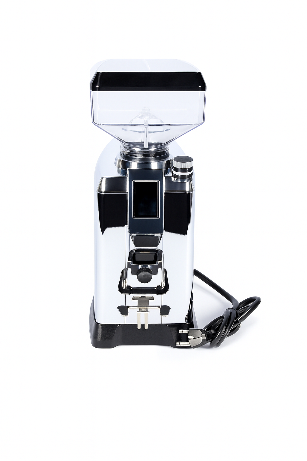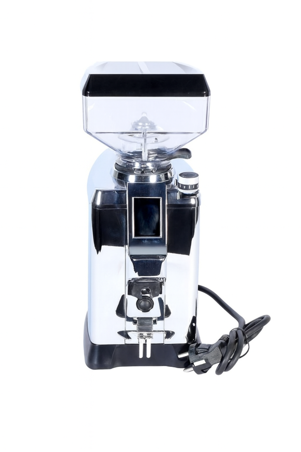 Heavy-duty coffee grinder with precision burrs and a clear bean hopper. Sleek chrome housing with adjustable grind settings ensures consistent results, perfect for espresso bars and specialty cafés.
