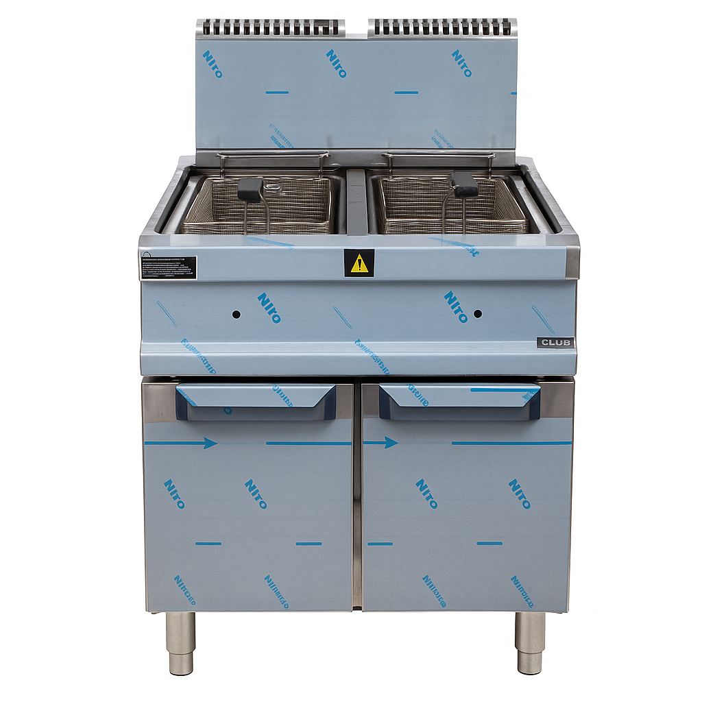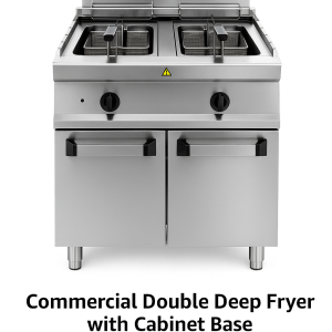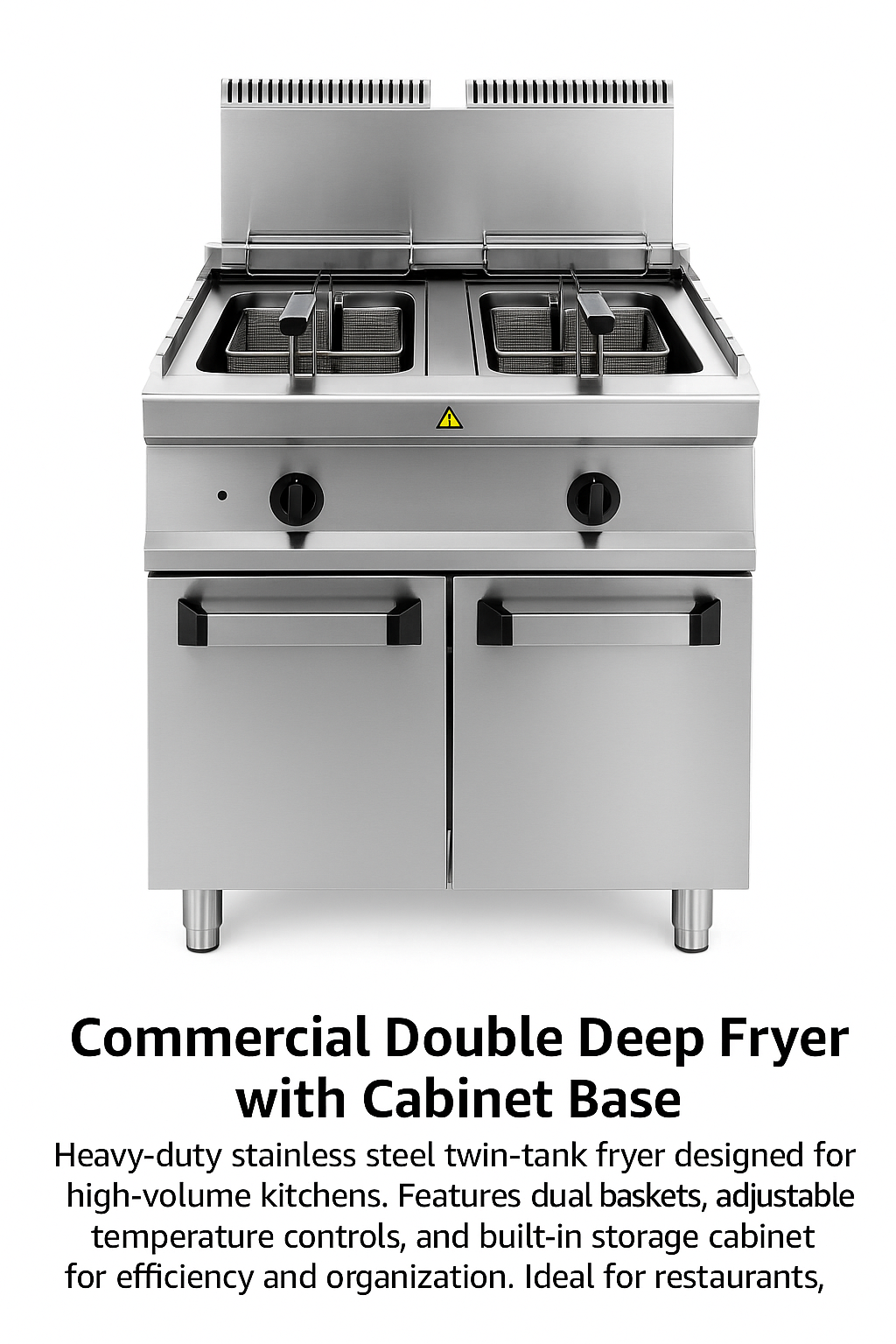 Heavy-duty twin fryer with built-in storage, perfect for high-volume frying of crispy fries, chicken, and seafood in commercial kitchens.