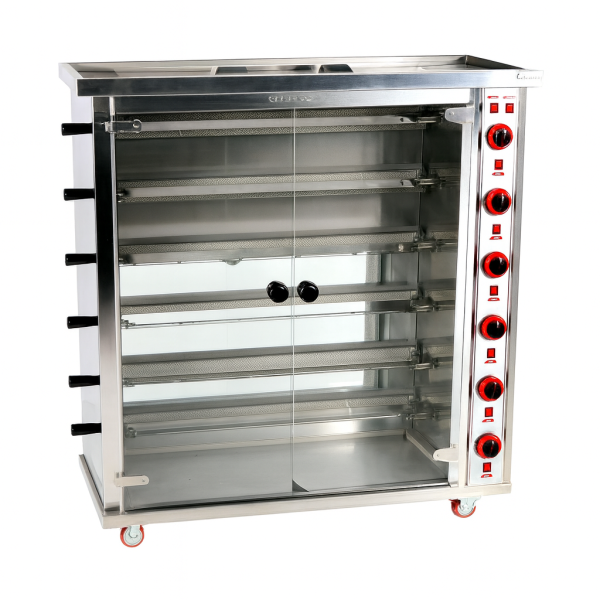 Stainless steel rotisserie with multiple spits and independent controls for even roasting. Large glass doors provide clear viewing, ideal for restaurants, hotels, and catering.