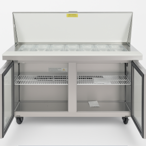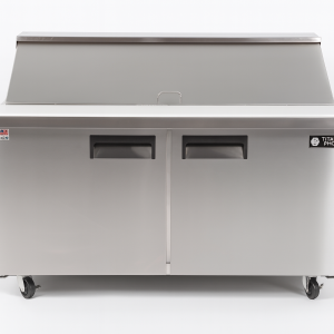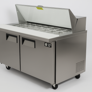 The Titan Pro Sandwich Prep Table is designed for efficient food preparation in busy kitchens. Built with durable stainless steel, it features a spacious refrigerated base, dual-access doors, and a cutting board worktop. The top compartment holds multiple ingredient pans under a protective hinged lid, ensuring freshness and easy access. Mounted on heavy-duty casters, this prep table combines mobility, durability, and functionality—ideal for sandwich shops, pizzerias, and restaurants.