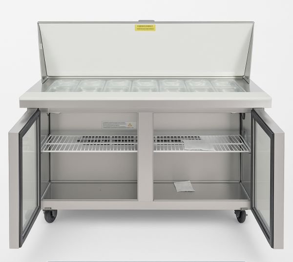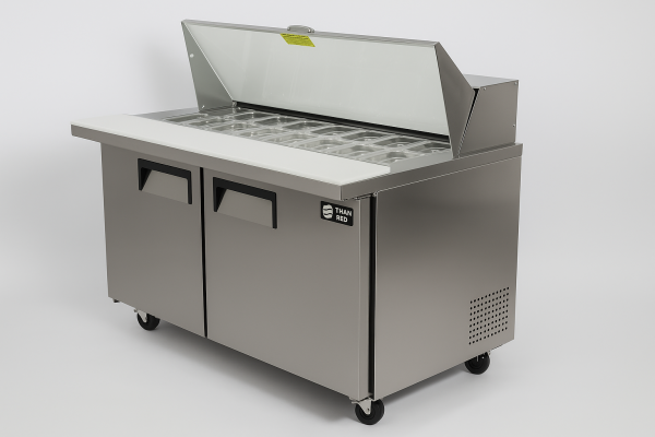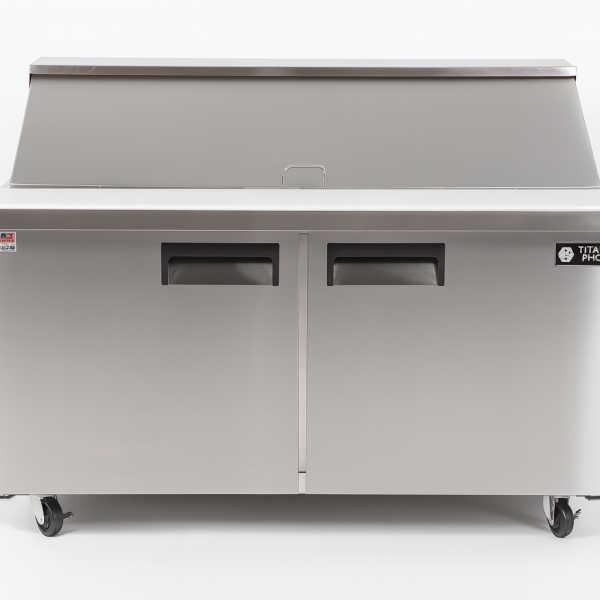 The Titan Pro Sandwich Prep Table is designed for efficient food preparation in busy kitchens. Built with durable stainless steel, it features a spacious refrigerated base, dual-access doors, and a cutting board worktop. The top compartment holds multiple ingredient pans under a protective hinged lid, ensuring freshness and easy access. Mounted on heavy-duty casters, this prep table combines mobility, durability, and functionality—ideal for sandwich shops, pizzerias, and restaurants.